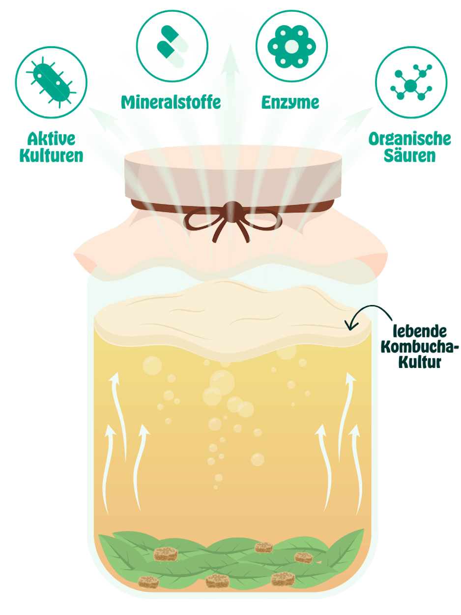 Anschließend verwandeln die guten Bakterien den entstandenen Alkohol sowie restliche Zucker in wertvolle Säuren und Enzyme um. Dieser Prozess sorgt für mehr Geschmackstiefe und macht Kombucha so besonders.